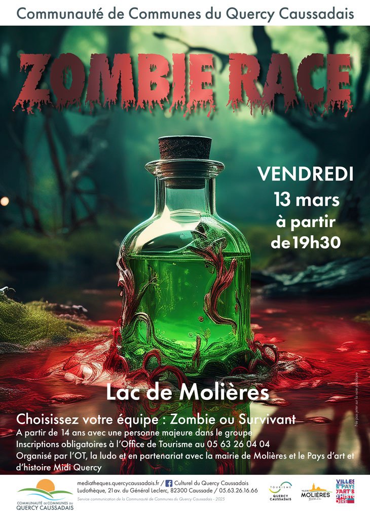 Un mystérieux virus se propage à une vitesse fulgurante, transformant les vivants en zombies ! L’antidote est votre seul espoir… mais le temps vous est compté. Venez fabriquer le sérum de guérison tout en découvrant les histoires étranges de Molières autour de son lac… Survivrez-vous assez longtemps pour récupérer les ingrédients et guérir les zombies ?